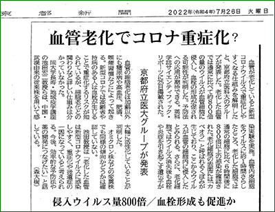 当科、池田宏二先生らの研究「血管老化でコロナ重症化?」が京都新聞に紹介されました。