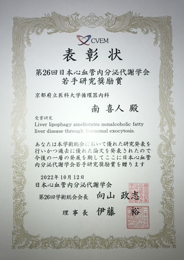 南喜人先生が第26回日本心血管内分泌代謝学会において若手研修奨励賞を受賞しました。