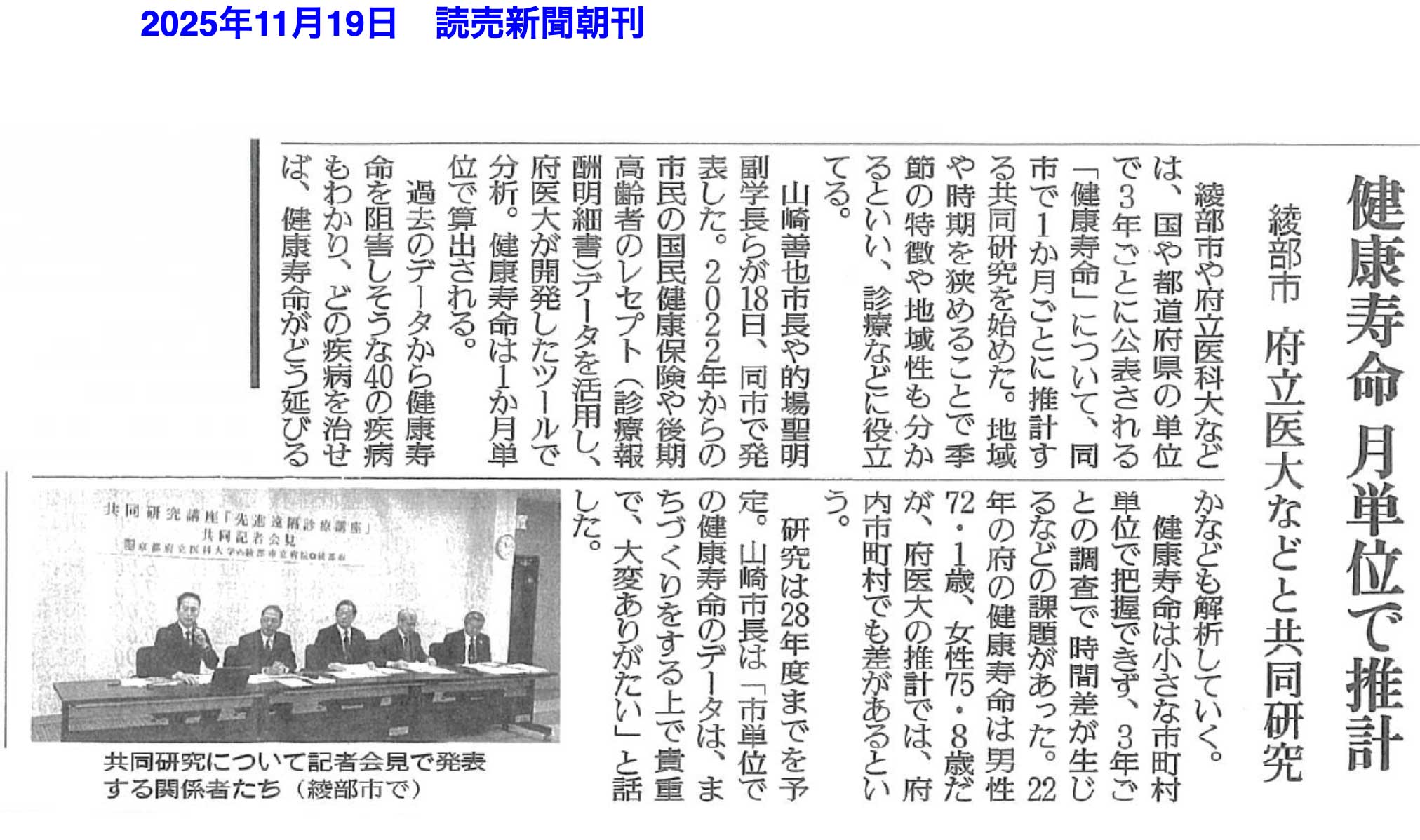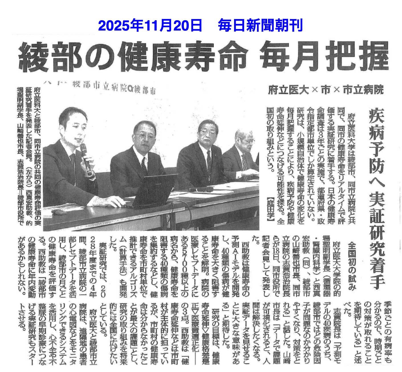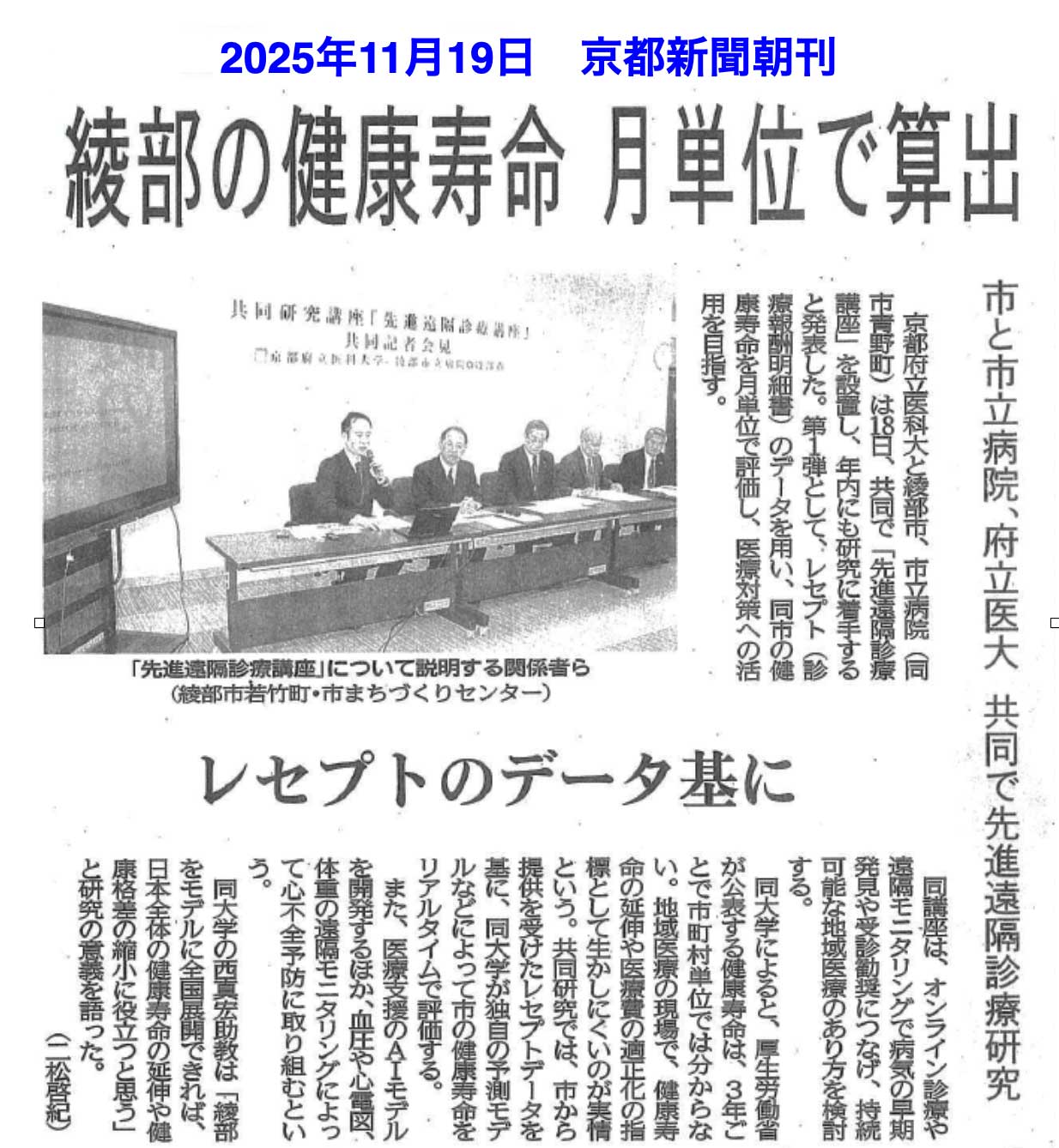 京都府立医科大学と綾部市医療公社との共同研究「先進遠隔診療講座」にて 医療レセプトデータを用いた全国初の取り組みとなる健康寿命のリアルタイム評価を実施します。